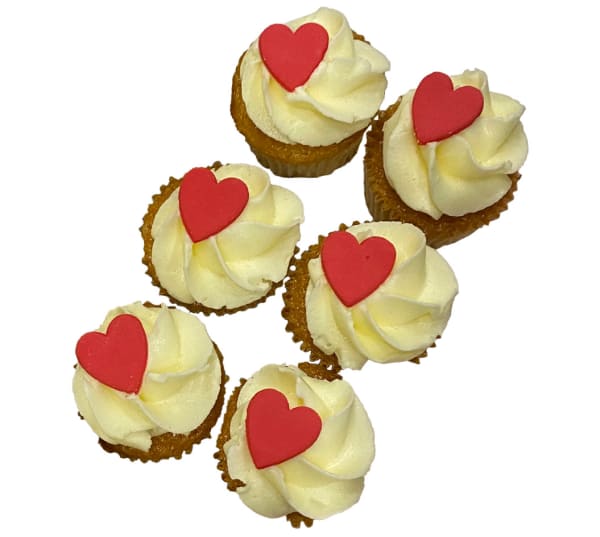 The classic and delicious mini vanilla cupcakes we all love, beautifully decorated with a swirl of white icing and a red love heart.